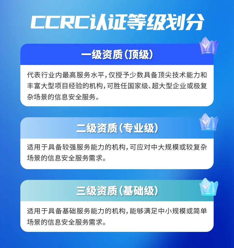 CCRC认证分为一级、二级和三级,其中一级为最高级别,三级为最低级别。